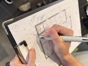 設計アシスタントスタッフの手元はメモでびっしりです!