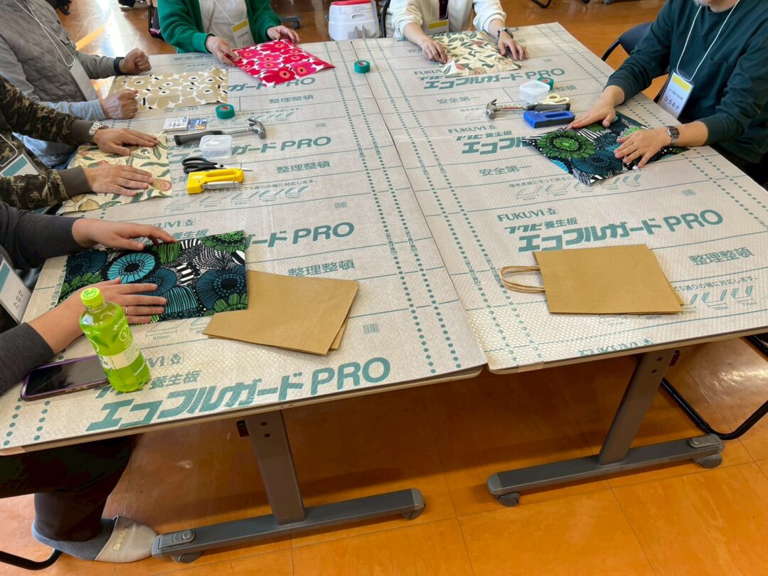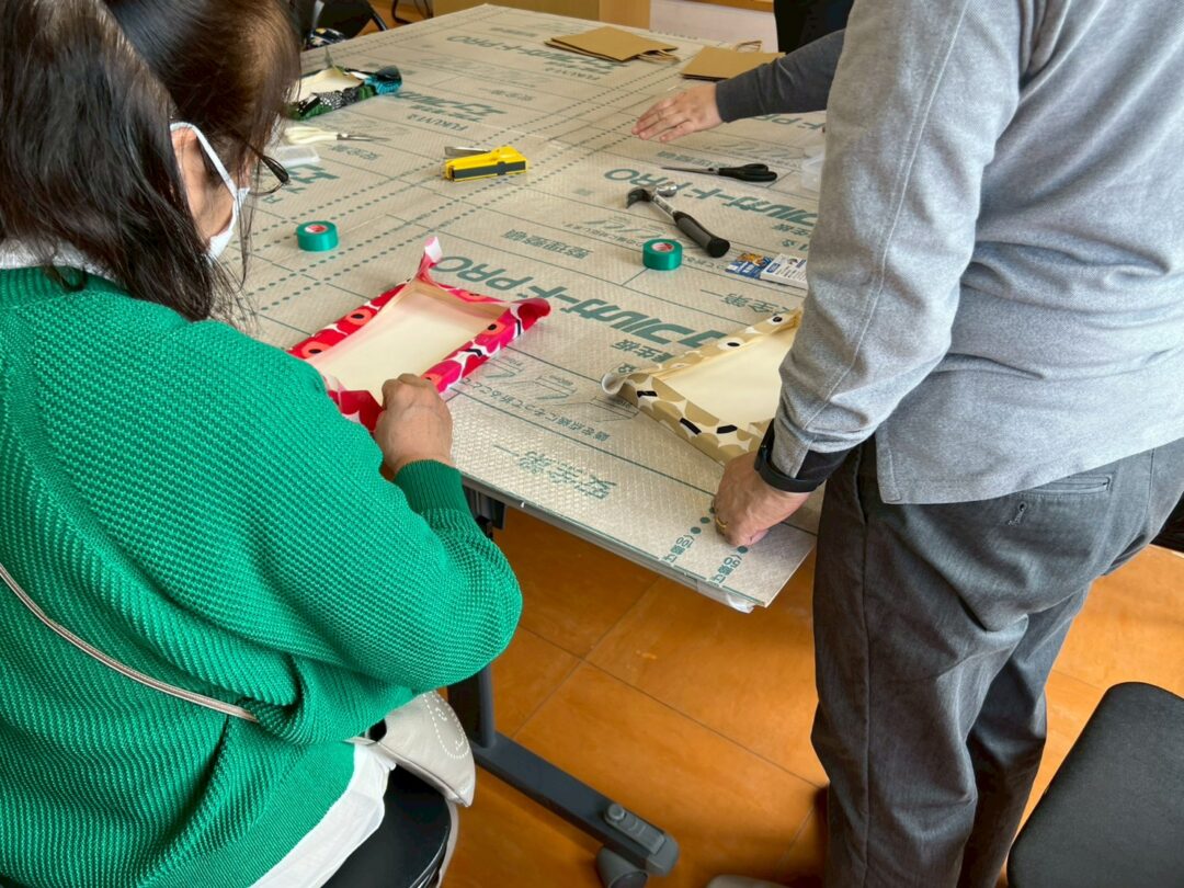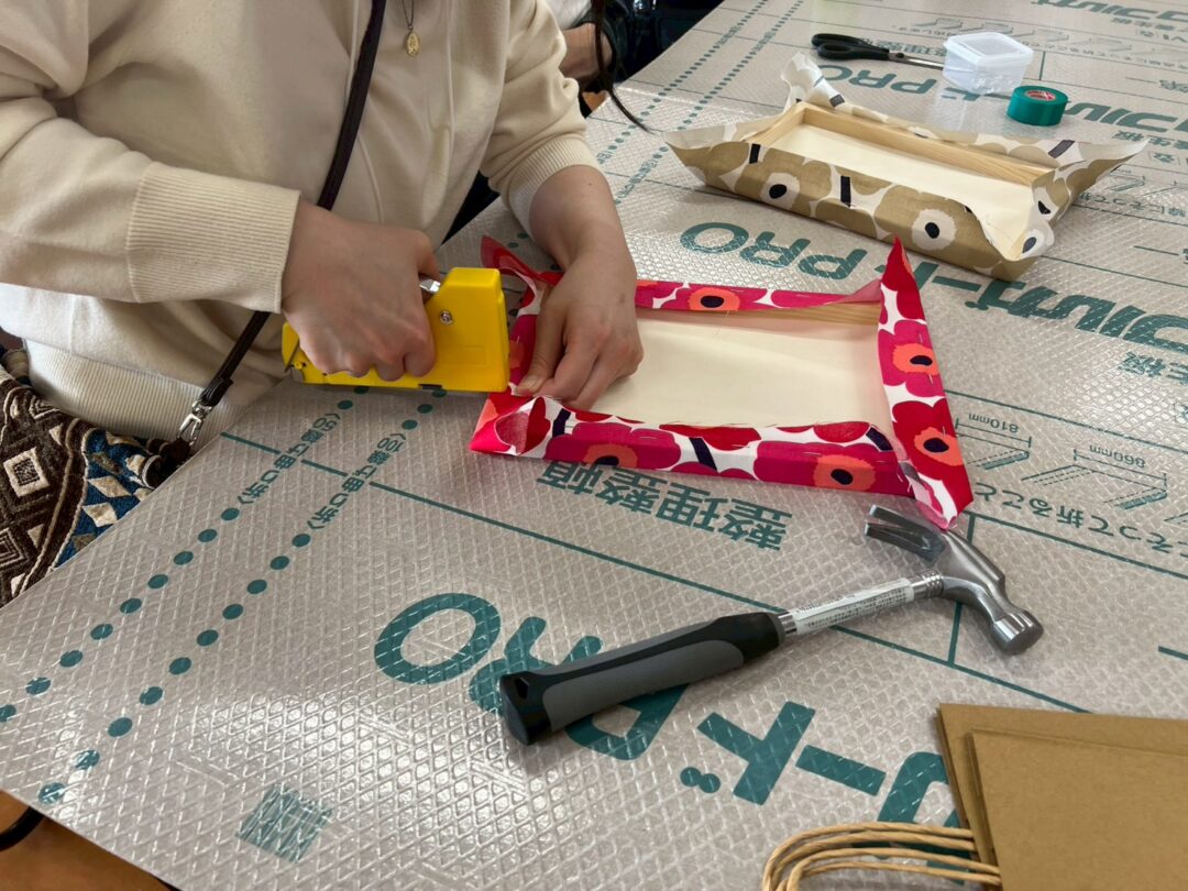 今年のワークショップでは、日本でも人気の「マリメッコ」や「ウィリアム・モリス」の生地を使ったファブリックパネルづくりを行いました。