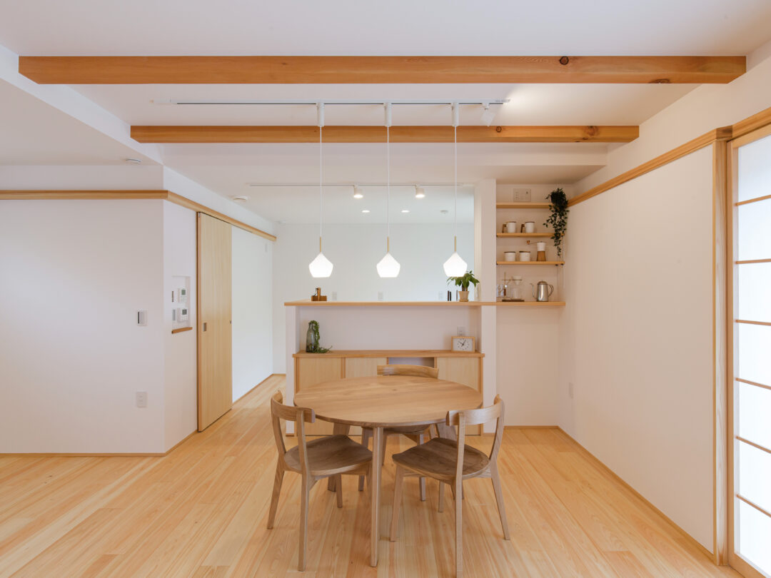 写真の平屋のお住まいでは、リビングダイニングや隣接する畳空間等、扉を介さないメイン空間には桧を、