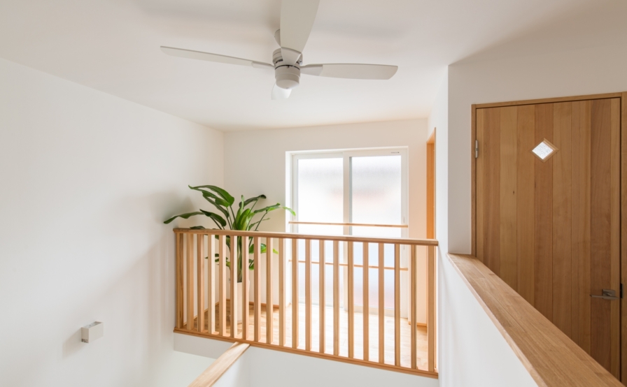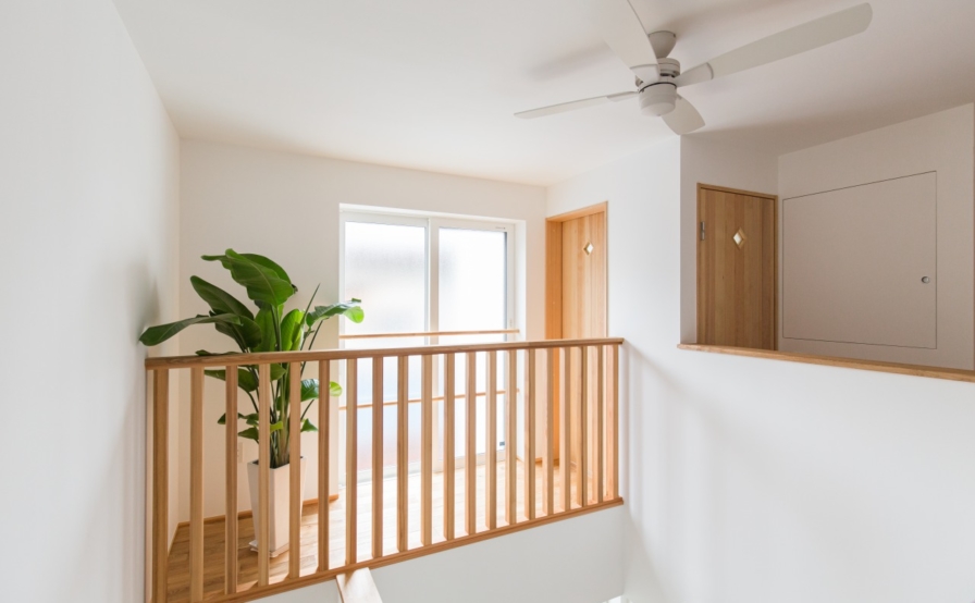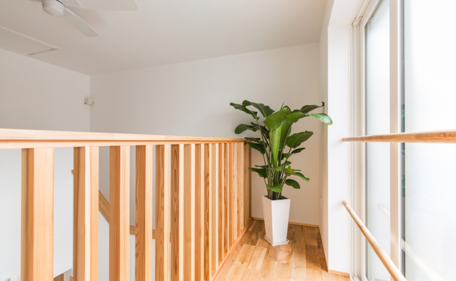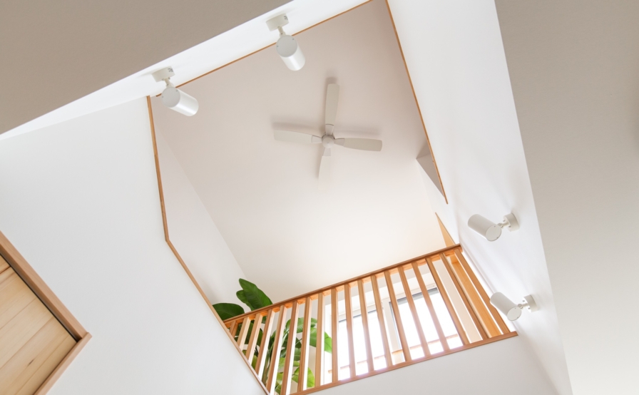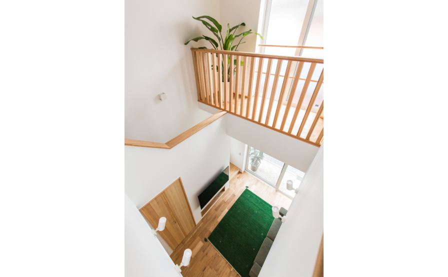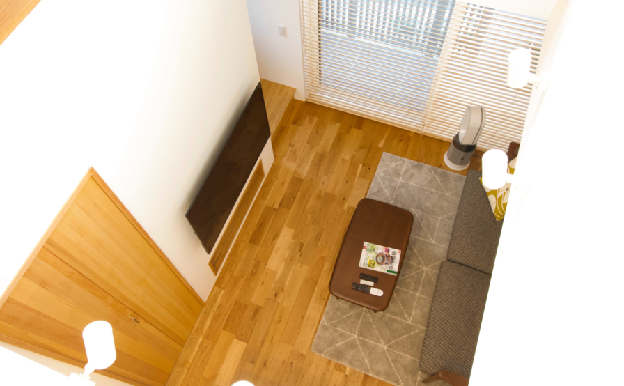 全熱交換換気とエアコンの組み合わせによる全館換気冷暖房システムにより吹き抜けがあっても冬寒くない、開放感のある空間を実現しました。