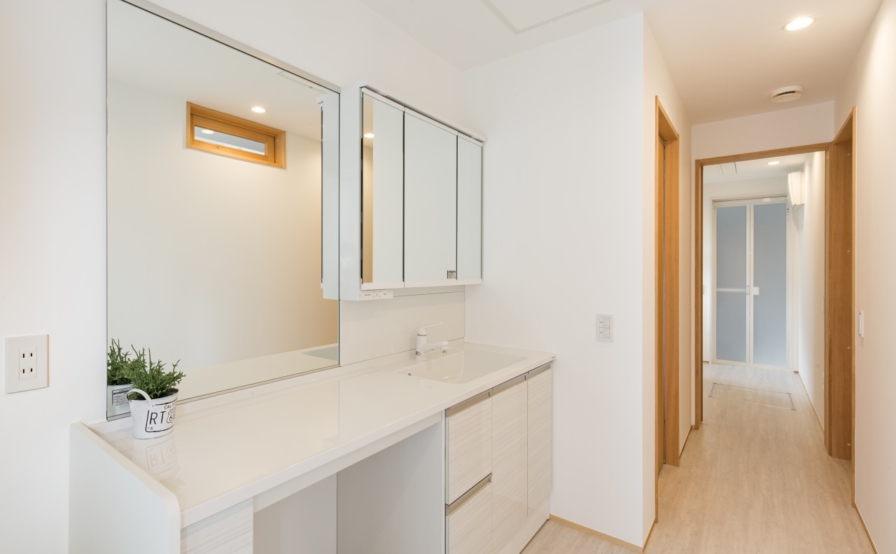 家事の負担を減らす動線を意識してお風呂・脱衣所・室内干し・洗面所・お手洗いと水回りがリビング横の家事室に全てまとめられています。