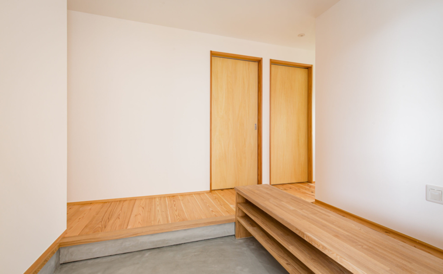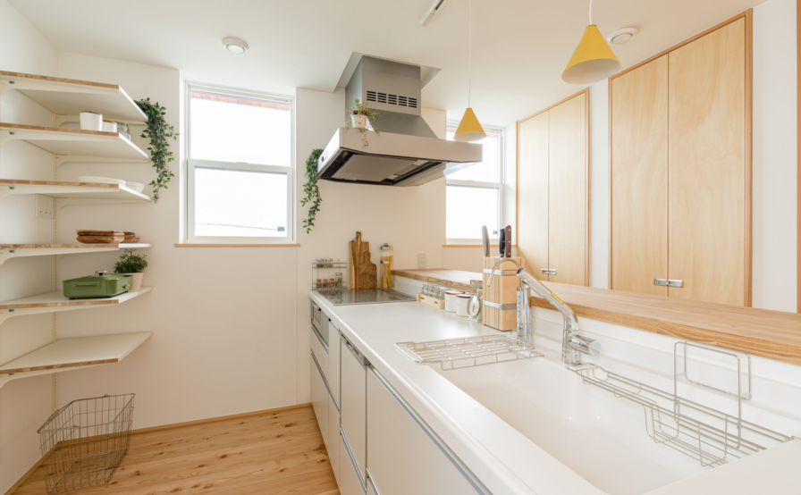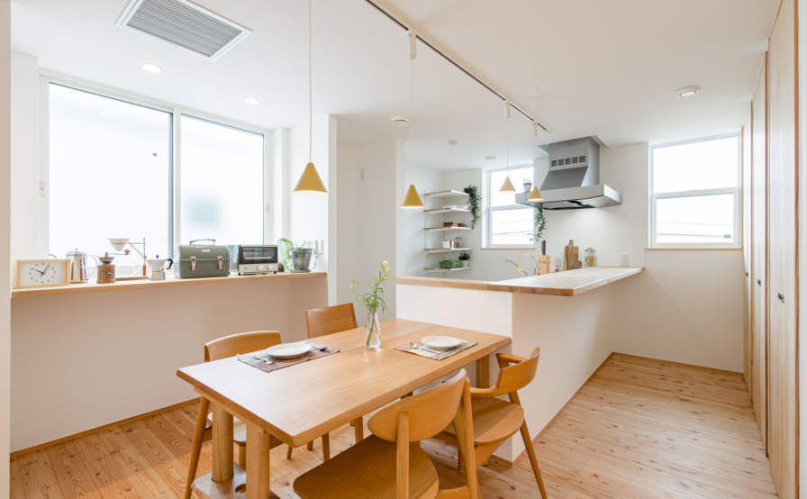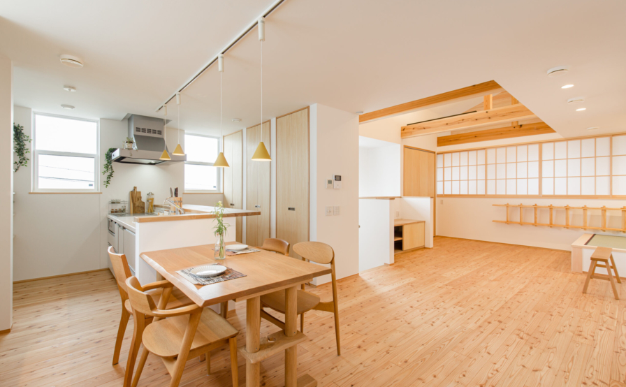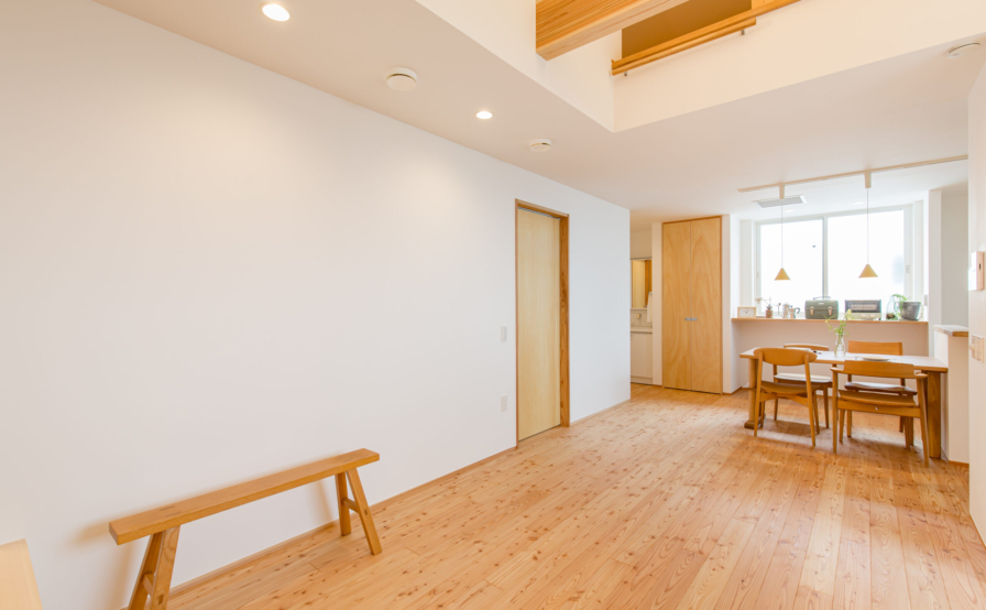 無垢の床としっくい調の天井壁のコラボレーションで、木の家をより木の家らしく演出しています。