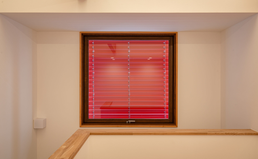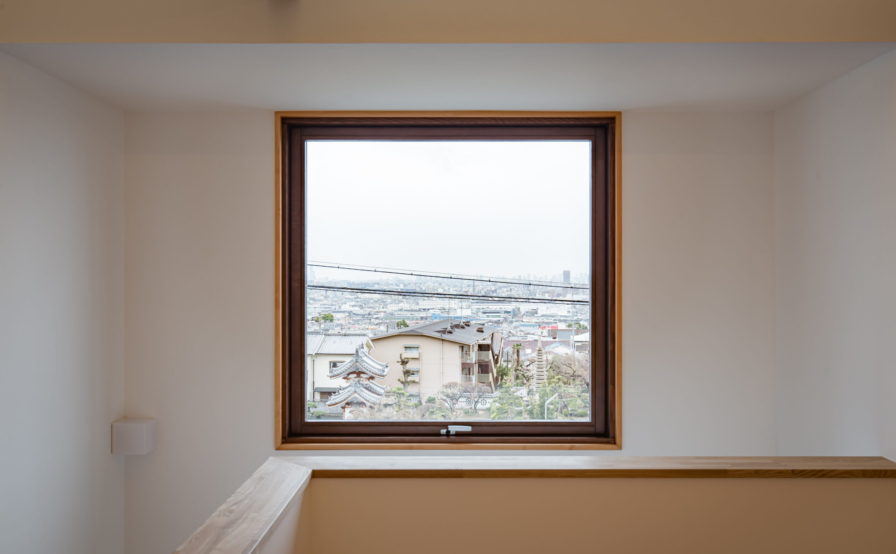 大阪平野を一望できる借景。木製窓を絵画の額縁に見立て、それはまるで風景画のよう。時間や季節によって移り変わる景色を室内にいながら楽しむことができます。