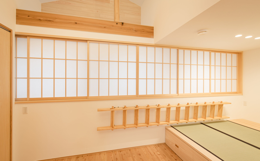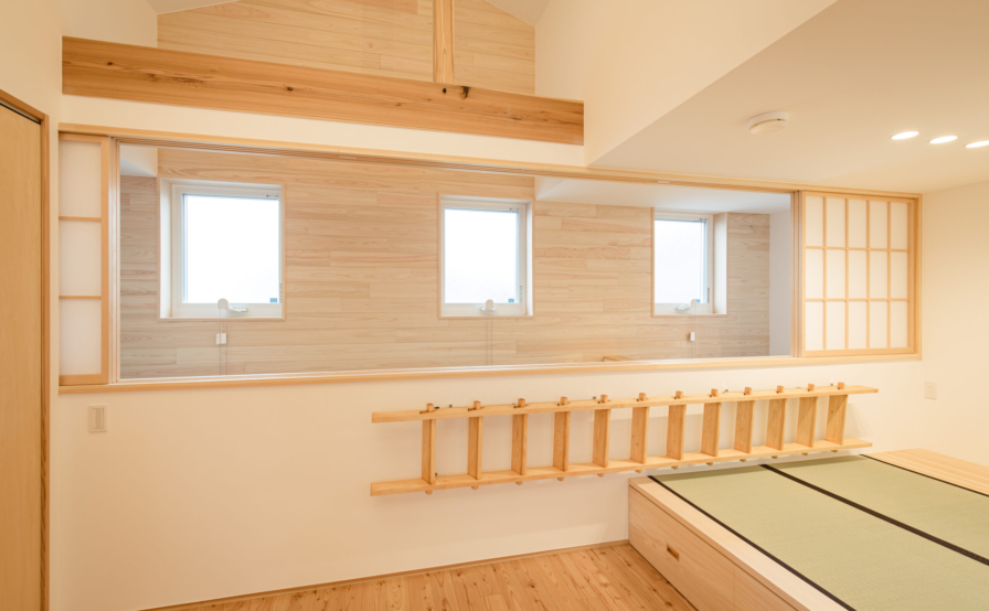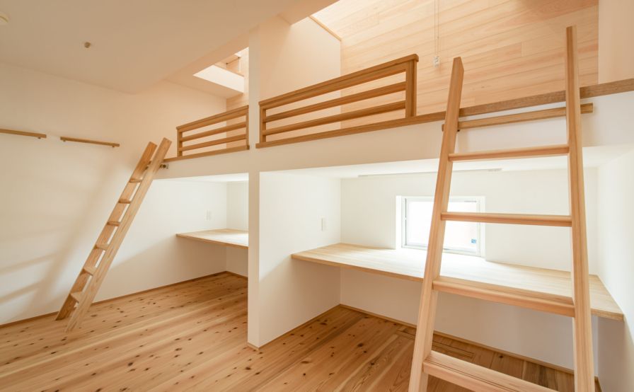 子ども部屋は3畳+ロフトベッド。実質4畳。ぎりぎりまで無駄を省いた子供部屋の設計。ロフトベッドの上部はリビングとの吹き抜けになっていて、わんぱくざかりの3兄弟にはとっ~ても楽しい空間。ママの『ごはんができたよ~』とロフト越しに呼びかける光景が目に浮かびます。