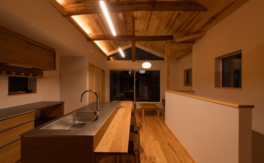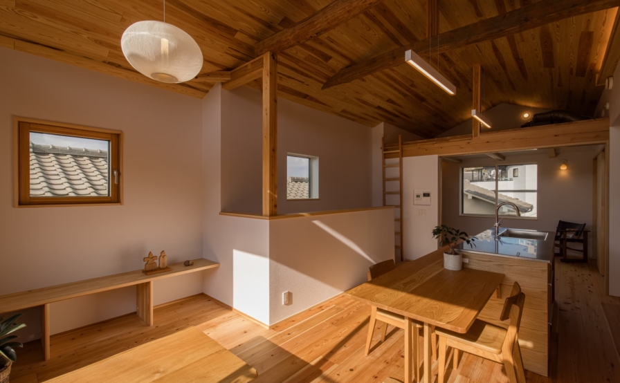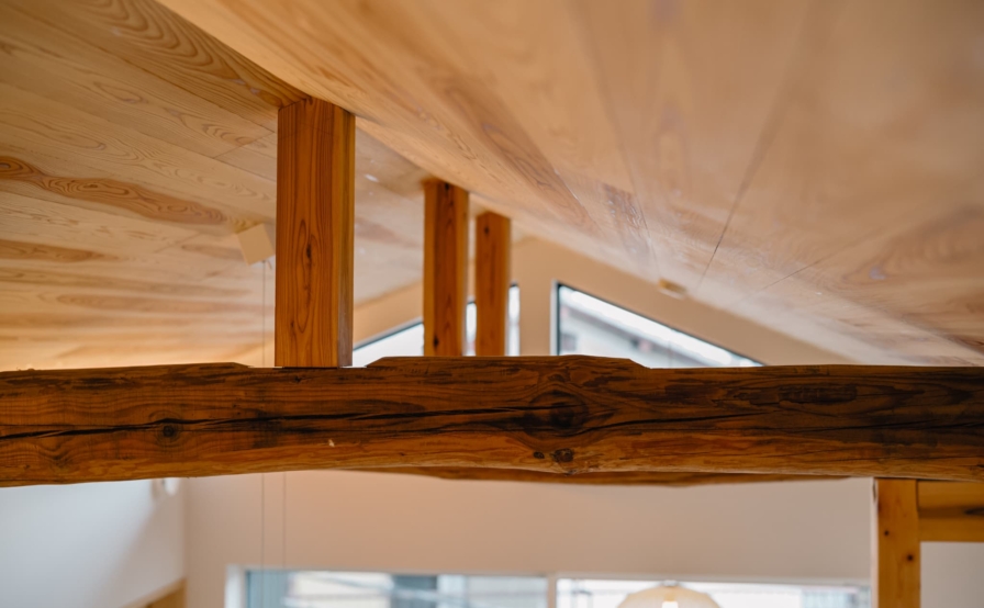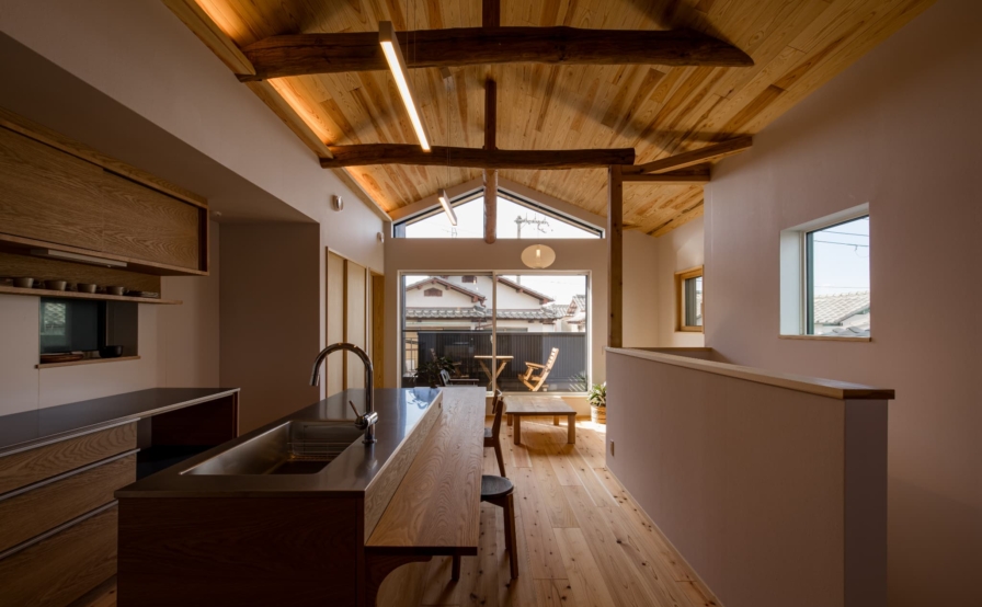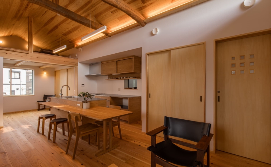 それを実現するために、耐震と断熱補強を施したうえで、2階リビングとしました。そのおかげで勾配天井となり、高さと南北に広がる広い空間が得られました。