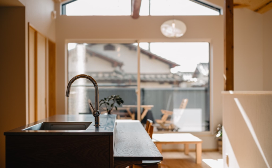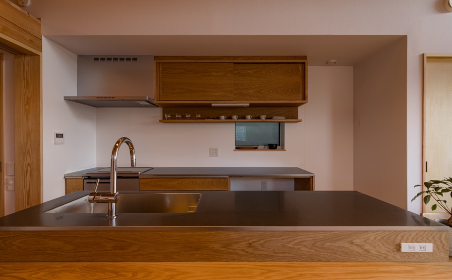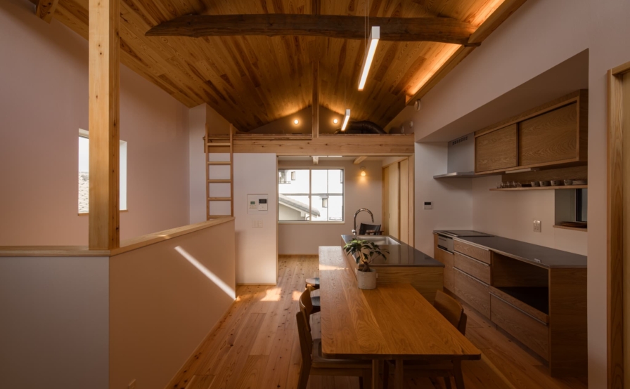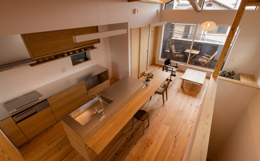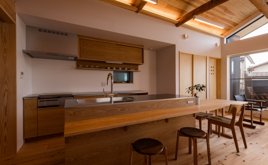 2階部分の中心には、テーブルが備え付けられた造作キッチンを配置することで、調理、食事、団欒を楽しむことのできる空間となっています。