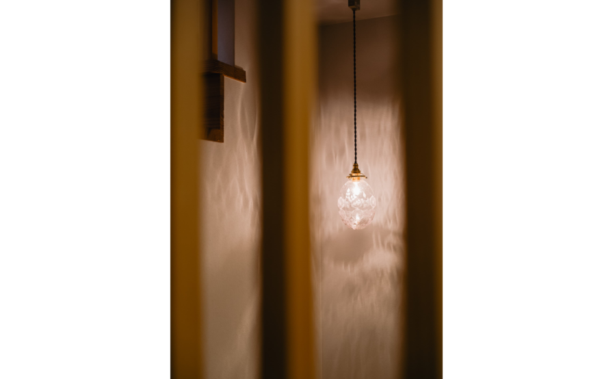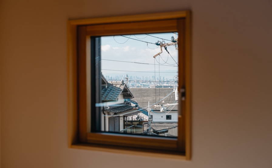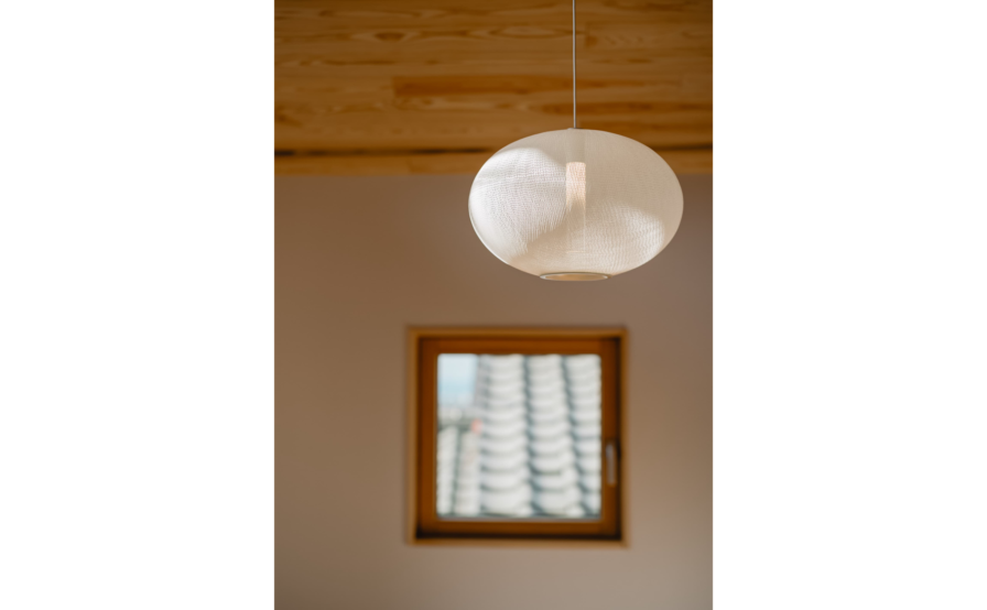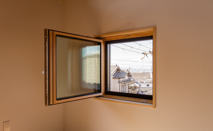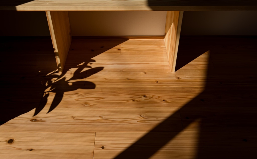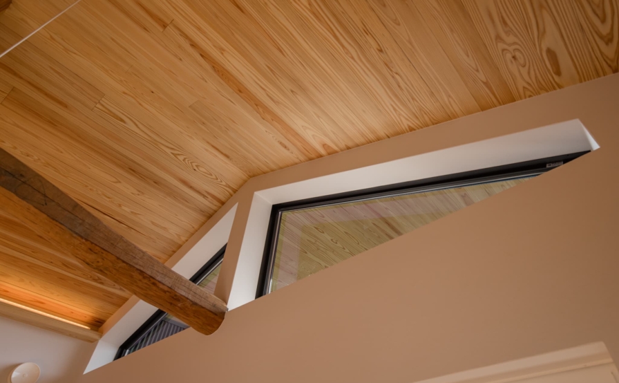 インナーバルコニーの軒天上には、室内側の天井と同様に杉板を張ることで、台形窓を通してあたかも天井が外まで続いているかのように見えます。