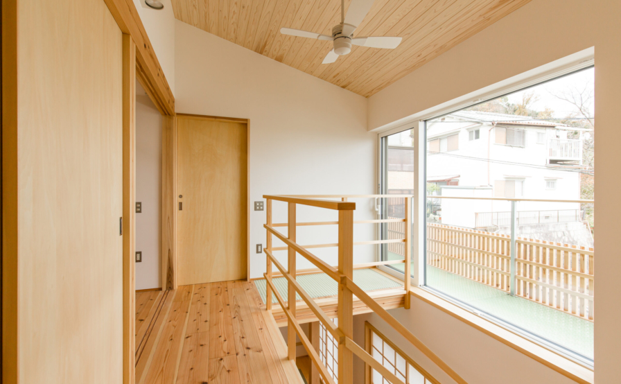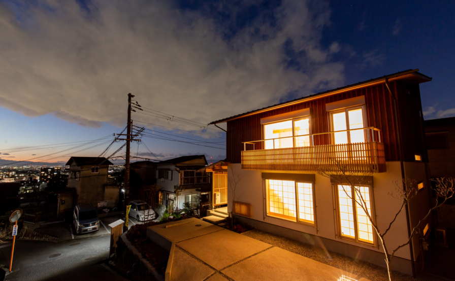 南面に配置された大開口の窓は、山の木々や大阪平野を切り取る借景を得ると同時に冬は太陽の熱を室内に取り込むパッシブ設計。