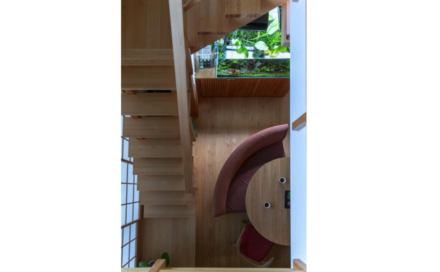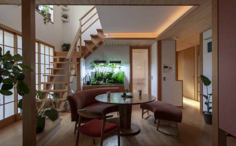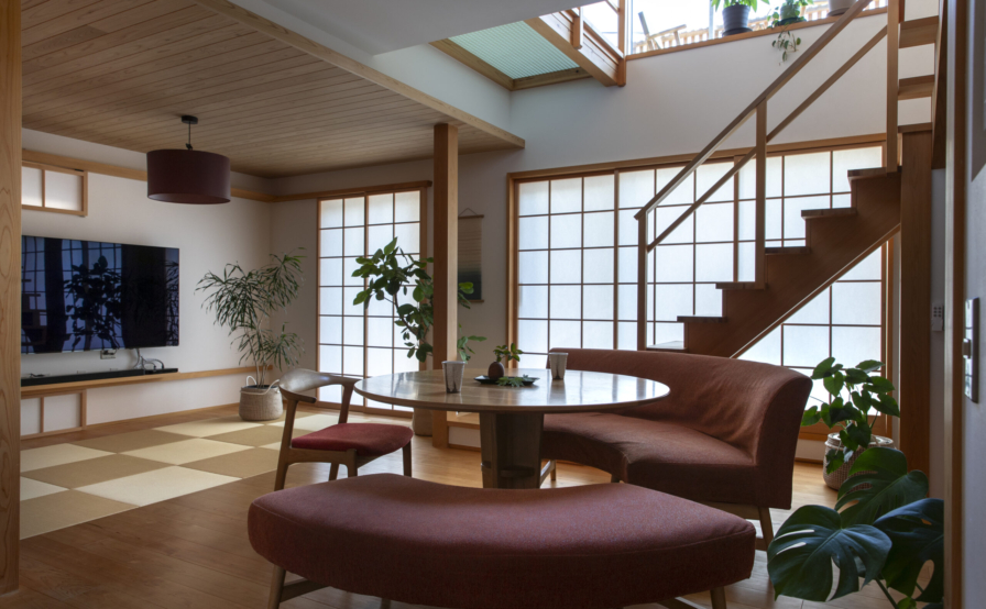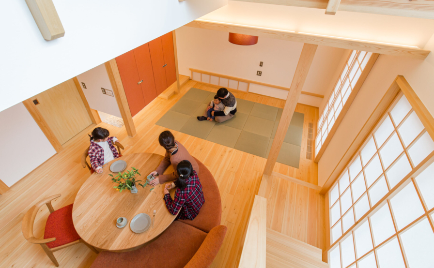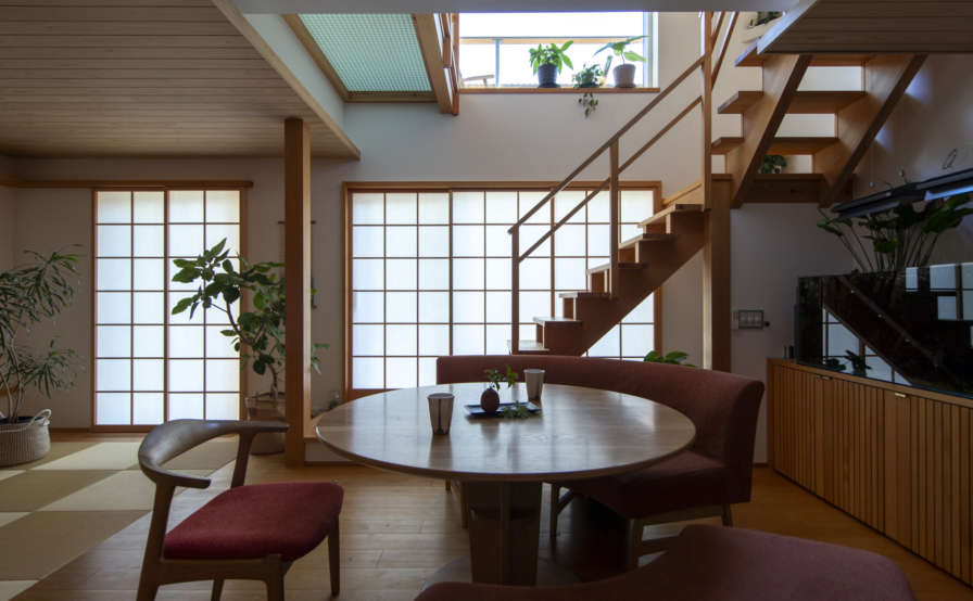 1階の中心には大きな丸テーブルを配置。家族が食事をする様は、囲炉裏やちゃぶ台を囲って食事をする―――、そんな日本人の昔ながらの生活様式を現代風に表しています。
