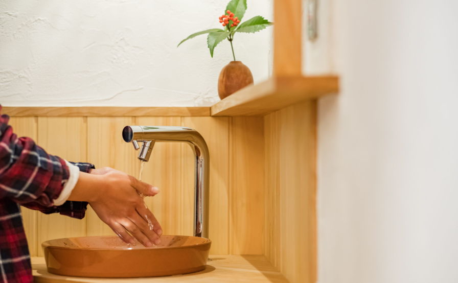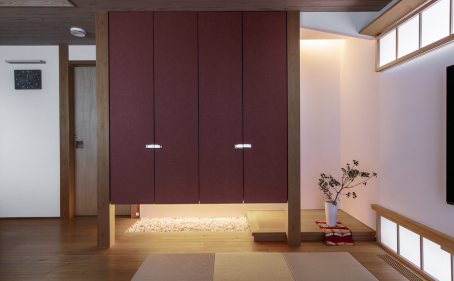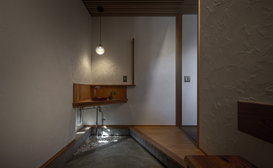 広めの土間玄関は天然漆喰壁で仕上げられていて、心地よい空気感で出迎えてくれます。