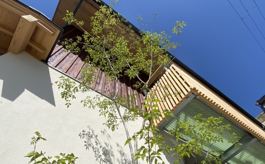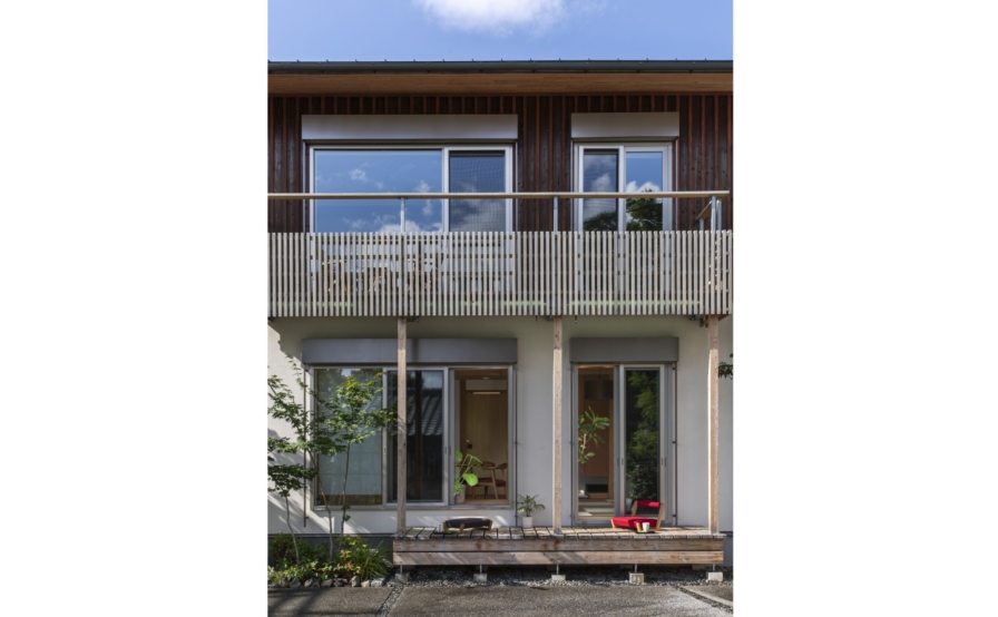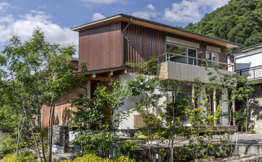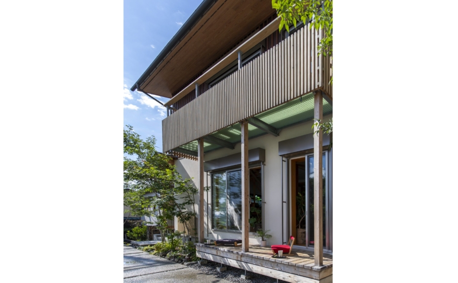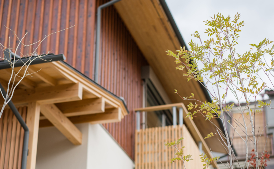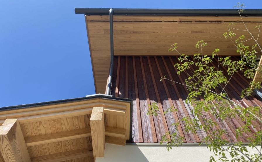 南の大きな窓と深い軒。焼杉の貼られた外観からは日本建築とパッシブデザインの調和が感じられます。