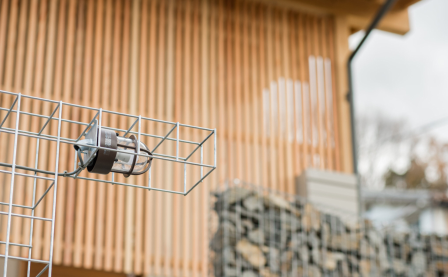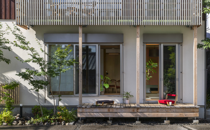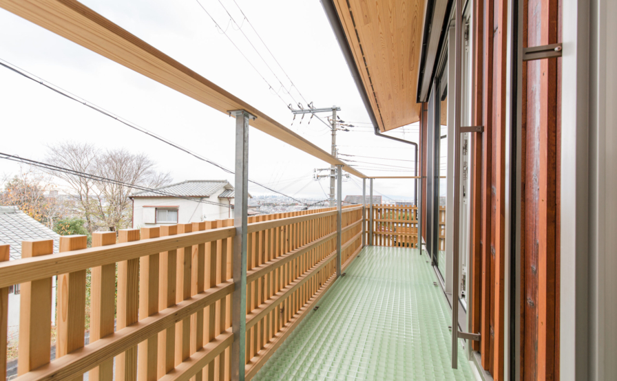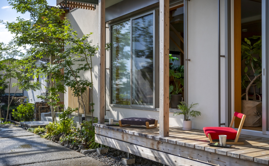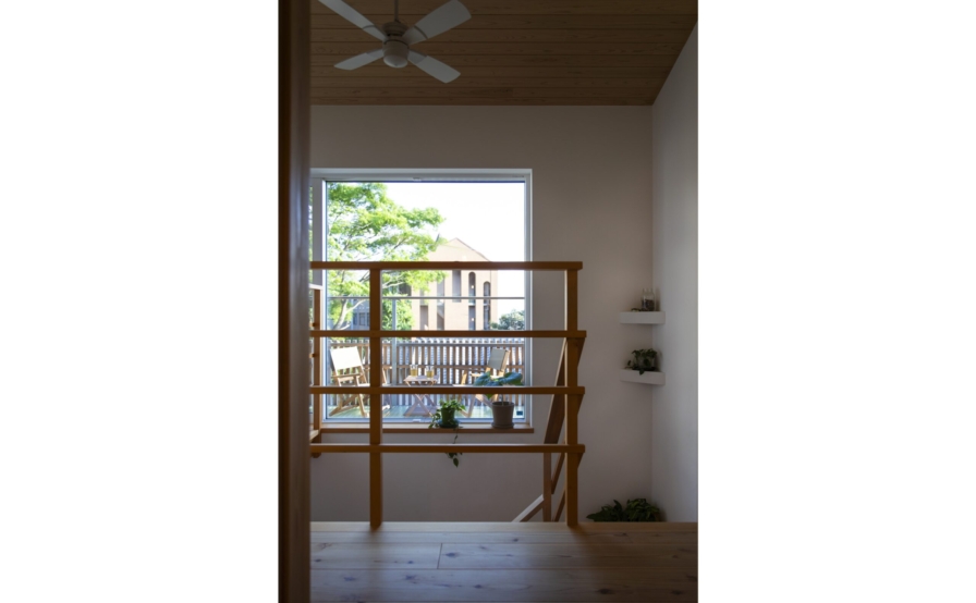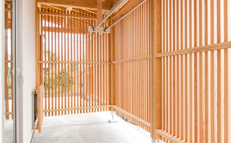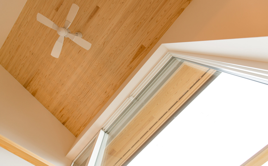 夏は深い軒が日射遮蔽をしてくれます。電動の外付けブラインドも、軒の出だけでは防ぎきれない日差しをコントロールするだけでなく、通風やプライバシーを同時に確保することができます。