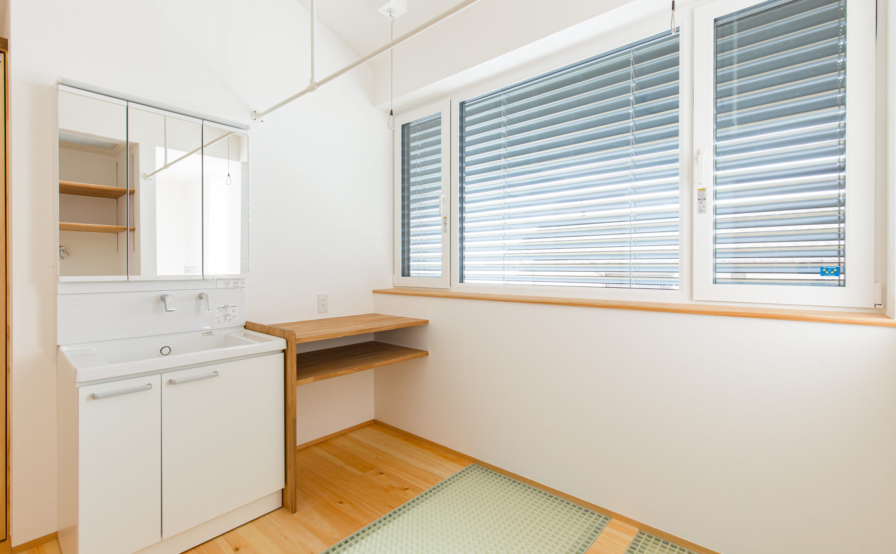 玄関に入ると、ホールには造作の洗面化粧台が設置されていて、帰宅後の手洗いをすぐにこちらで出来るようになっています。DAIKOstyleでは、「ただいま手洗い」と呼んでいます。コロナ禍以前から、ご提案はしておりましたが、最近は特にご要望が増えています。