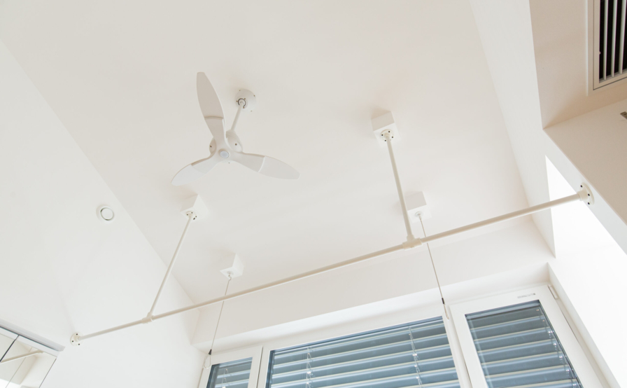 2階ホールは、FRPグレーチングにより光と空気が行き交う歩ける吹抜けとなっております。さらに傾斜天井にすることで開放感ある空間になり、天井より吊るされたシーリングファンによって空気の攪拌がされることによりFRPグレーチングや階段室を介して、家中の温湿度が一定となります。