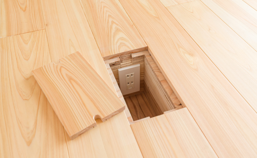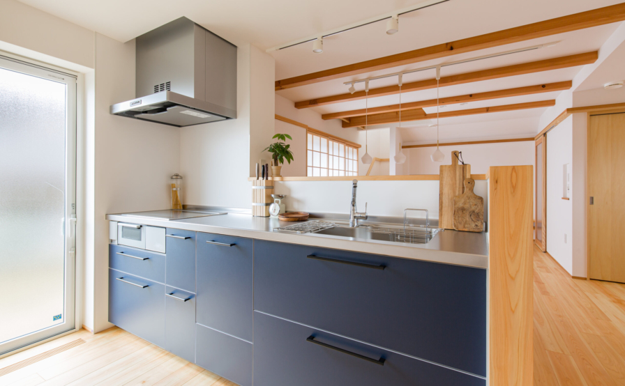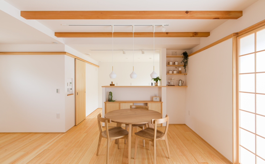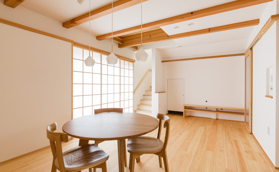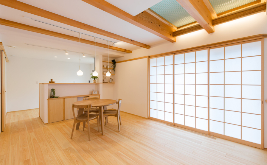 リビングに入ると、吉野桧の床材が広がるリビングダイニングキッチン。南面にはトリプル樹脂窓の大開口サッシを設置し、日射を調整するため外側には電動ブラインドを設けています。また室内側には、3枚建ての内障子。戸袋に3枚とも障子をしまえば全開口できるようになっています。