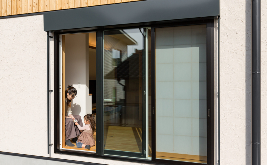軒の出は1mとかなり深くなっており、2階の窓は、これだけ軒が出ていれば夏場の日射遮蔽は十分ですが、総2階建の場合、1階部分は軒だけでは日射遮蔽は難しく障子と外付けブラインドをうまく使うことで、日射取得と日射遮蔽をコントロールします。