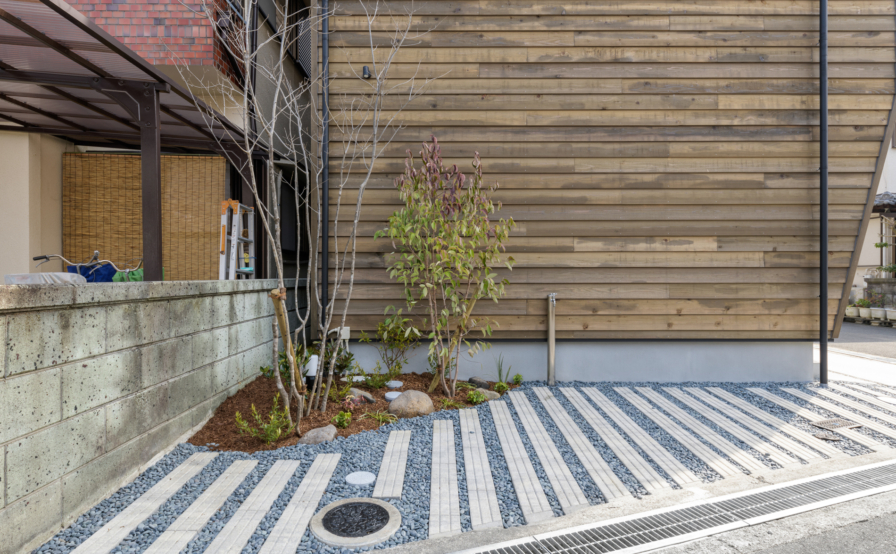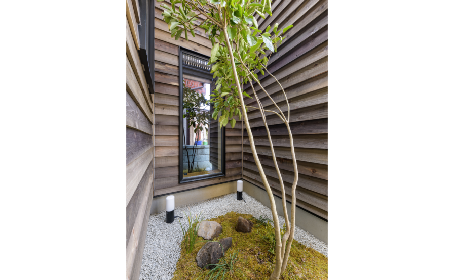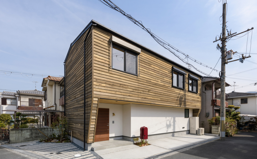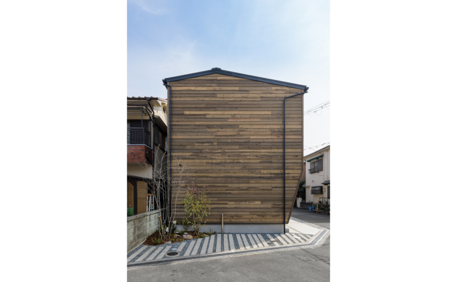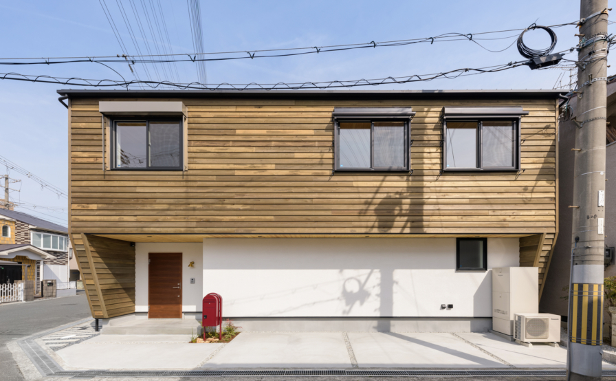 金属サイディングの代わりに、選ばれたのが 杉板外壁鎧張りでした。敷地が住宅地の中でも角地という事もあり、結果的には 周りにはない ひときわ目立ったランドマーク的な外観となりました。