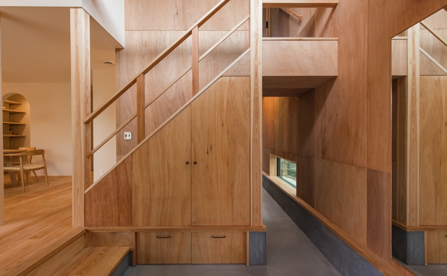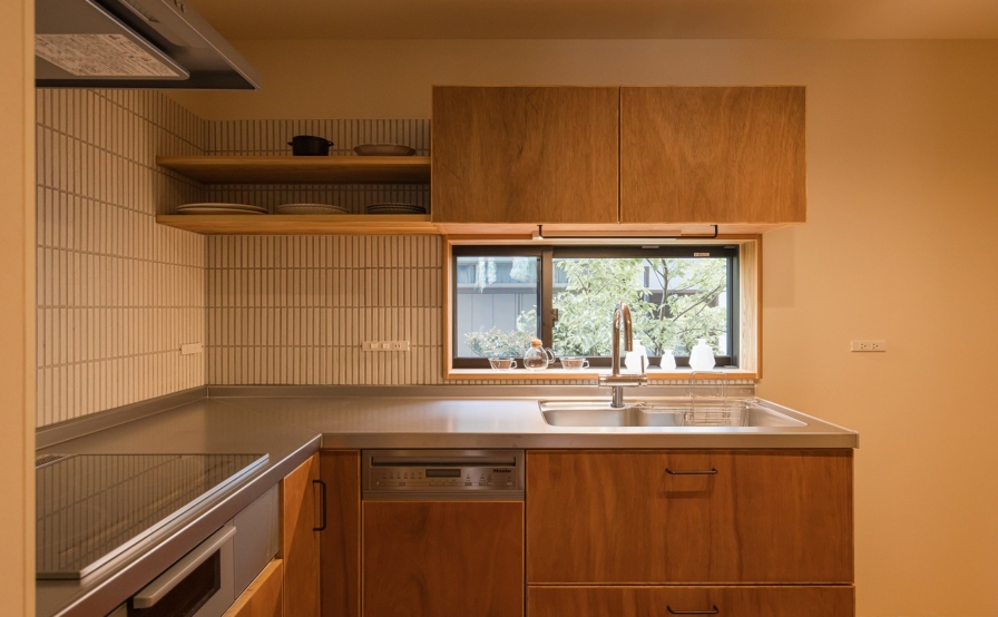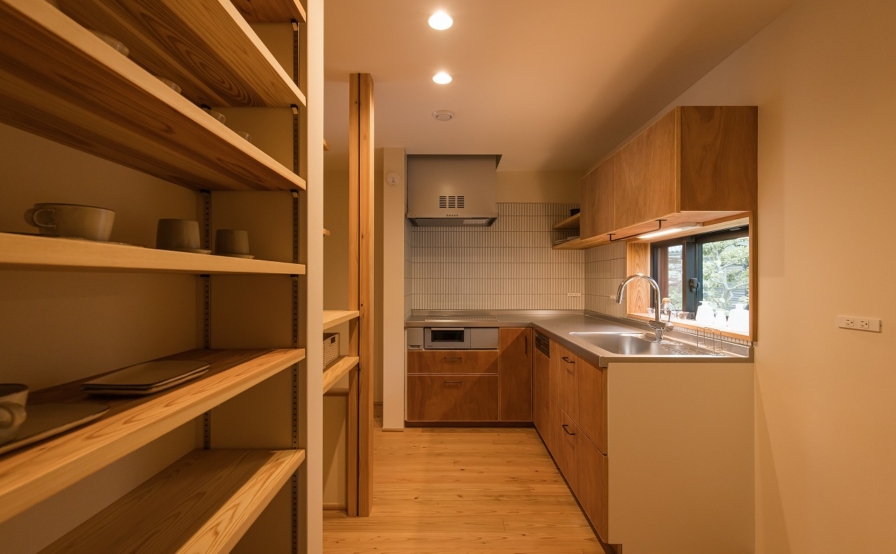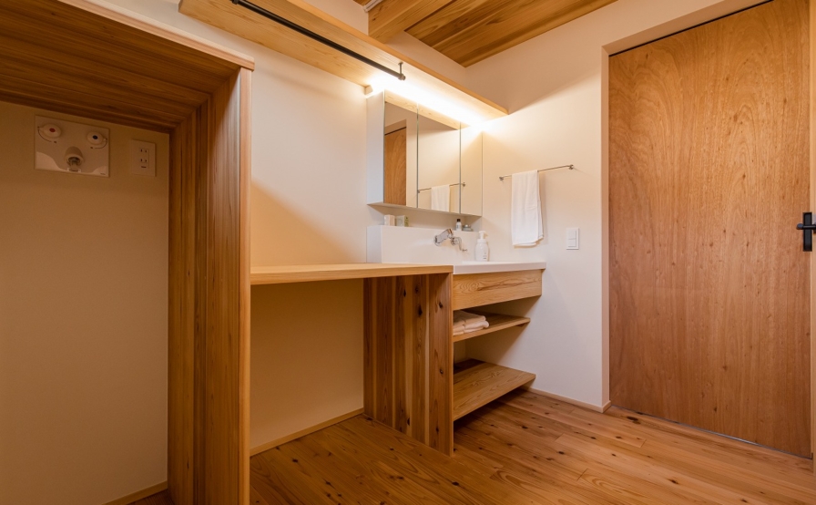 外壁には焼杉、内装には吉野杉の赤勝ちのフローリング。壁や天井の一部にはラワンを使っています。製作建具もラワン、キッチンも扉もラワンを使うというこだわり。またメインの壁には白ではなく、ベージュがかった色味の仕上げで、全体的に色温度の暖かい空間に仕上げられています。細部にまでこだわられた色の使い方も、センスの良さもこだわり方もやはり奥様のお仕事柄でしょうか、流石の一言でした。
