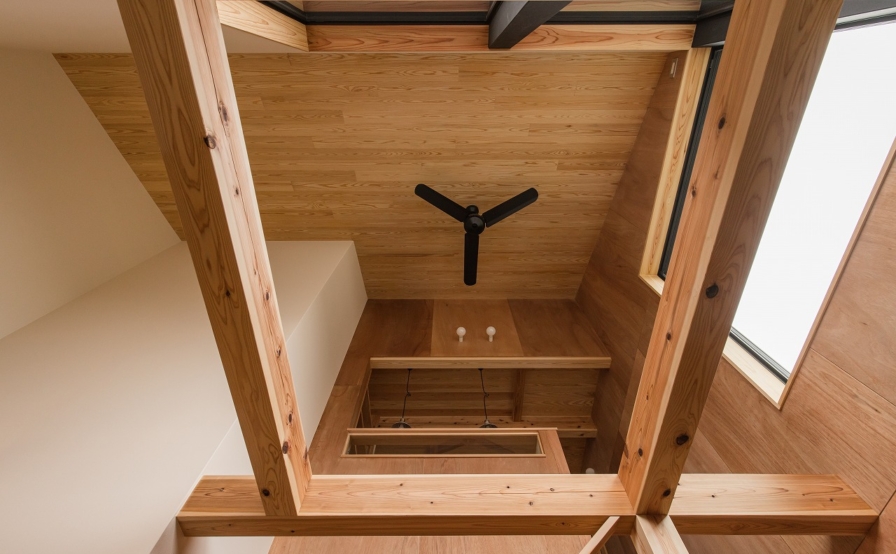 西大寺の家は約50坪弱という比較的ゆったりとした敷地面積ですが、風致地区であるため建蔽率は40%、容積率は60%ということで、家の大きさは29坪以下に抑えなければなりませんでした。しかしわずか29坪という限られたスペースではありましたが、これだけのボリュームのある空間にまとめられるのは、廊下や玄関ホールなどを省き、ロフトでも寝ることができるくらい家じゅうの温度が一定でどこもが居場所となる高断熱住宅ゆえにできたプランだと言えます。