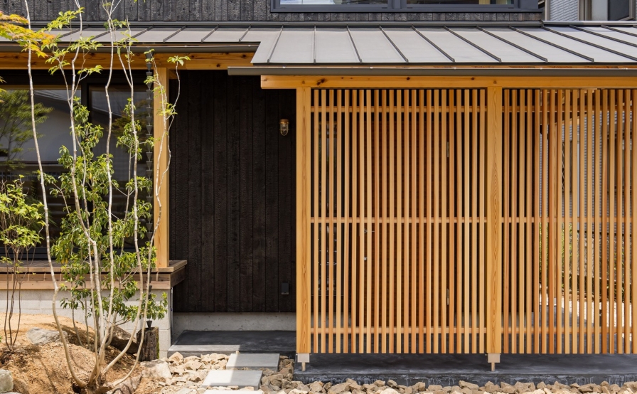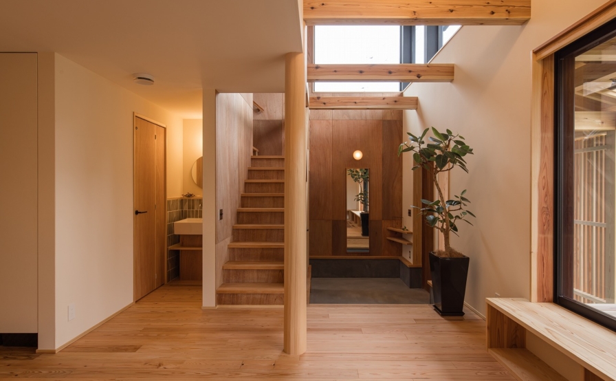 こういった古い町並みの残るエリアには景観法により建物の形状や色などに規定があり町並みを損ねないように配慮が求められます。設計にあたりまず初めにしたことは周囲の散策。周辺の建物や町並み、望む景色から思い浮かんだ家の形は、4間角総2階建て田の字型の家でした。屋根の流れ方向に入り口を設けた平入りにし、ポーチ部分には広い下屋根を掛け、玄関が外から丸見えにならないように、下屋根を支えるあらわしの柱に面格子を設けました。また玄関を入るとこれまた広めの土間と吹抜けのある広い空間。そしてそのままリビングとなります。玄関土間の右手の通り土間からはキッチンや裏庭へと抜けていくことができるようになっています。