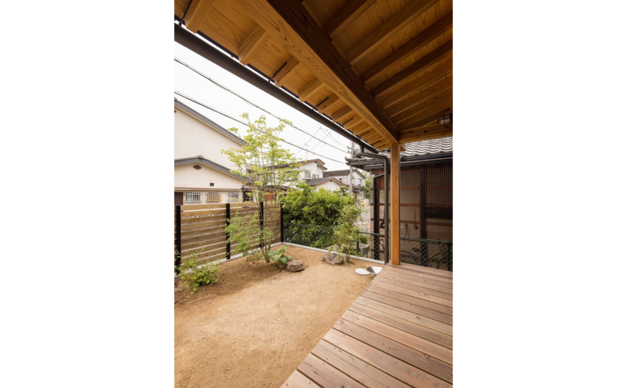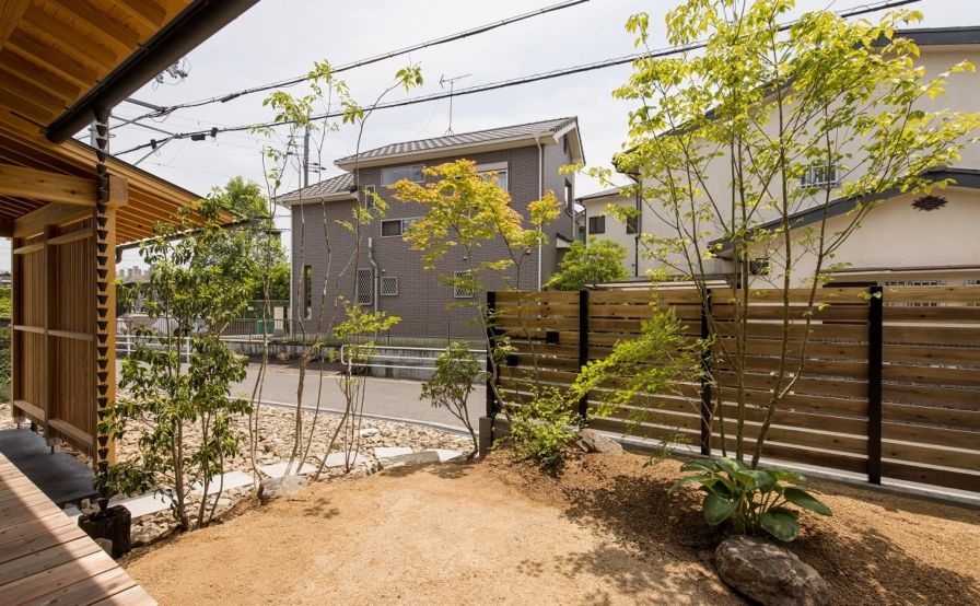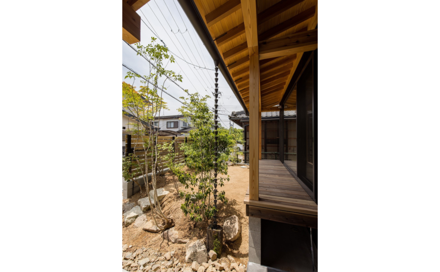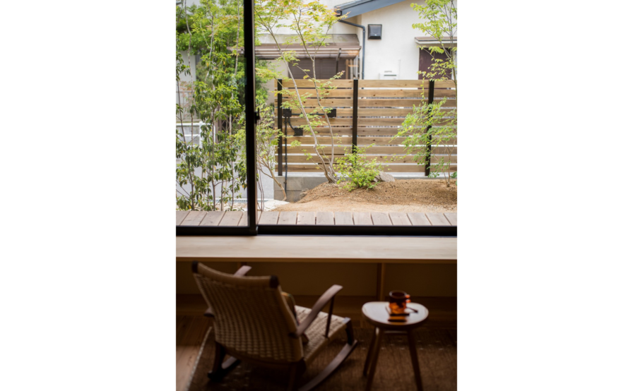 西大寺の家のこだわったところを上げるときりがありませんが、一番をあえてあげるとすれば庭の土をかさ上げしたことでダイニングテーブルの位置からチェアに腰を掛けた時に庭とリビングがひとつづきに見えるように工夫したところです。庭への掃き出し窓を高さ40㎝のベンチ兼収納の上に設置し、その先に縁側(ウッドデッキ)を設置するのですが、そのままだと地面からの高さが1mほどになり、庭から腰掛けることもできませんし、リビングからも地面が見えず庭が遠くなってしまします。そこで、庭に土を入れ60センチほどかさ上げし、ちょうどリビングと庭の高さを同じくらいにしてあげ、庭からも縁側に腰かけることのできる40㎝ほどの高さとなりました。これによりリビングからも地面や庭木の根元も見え、庭が近くなりました。