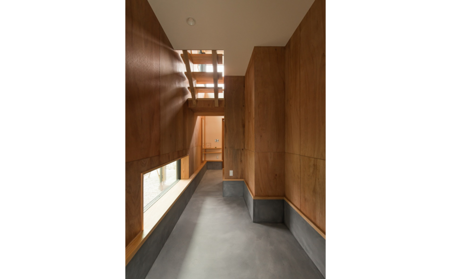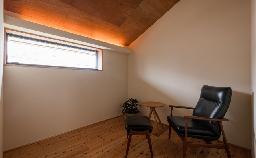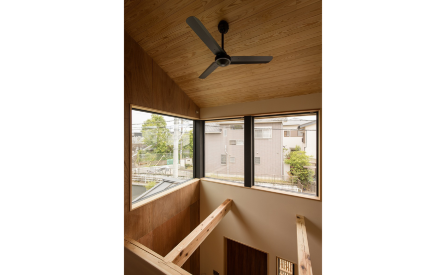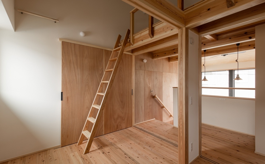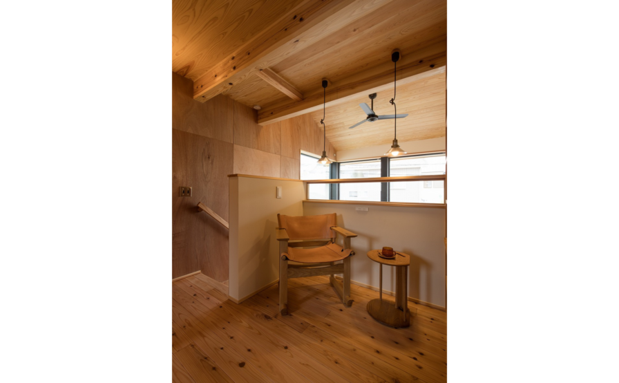 吹抜け階段を上がると、可変性を持たせた子ども室。お子さんが小さい間は一部屋として使い、個室が必要な年ごろになれば、ケンドン式建具で間仕切り2室にします。さらに、年の離れた上のお子さんが独立すれば、また一部屋に戻します。そして、下のお子さまも独立すれば、入口の引違戸を外し、ホールやセカンドリビングとして利用できるようにしています。