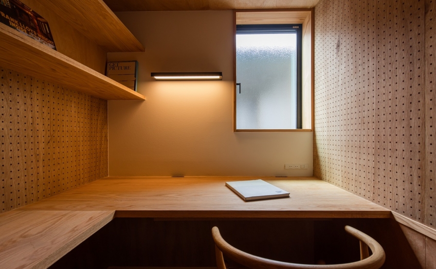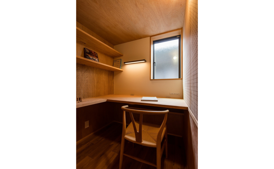 リビングの奥には、WEBデザイナーである奥様のワークスペース。ワークスペースの位置は、仕事と家事育児を両立できるように奥まった位置へ配置。ワークスペースの窓からは、奥さまお気に入りのマルバノキが見られます。