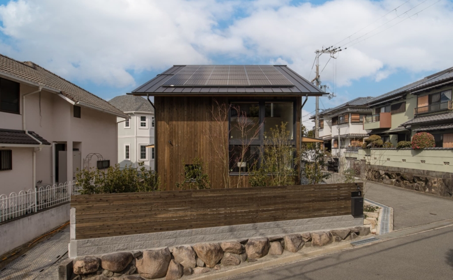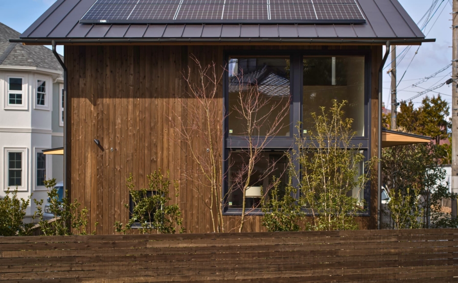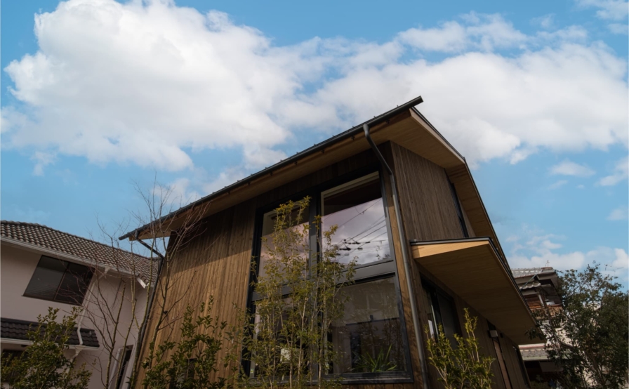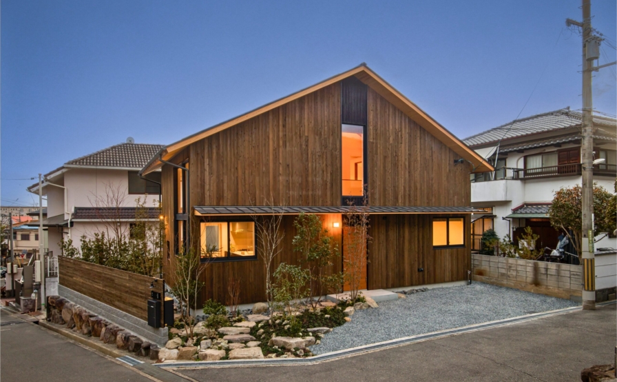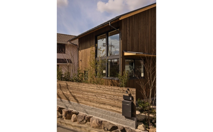 都市の喧騒から少し距離を置いた、静かな住宅街の角地に建つ、凛とした木の家。