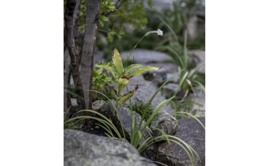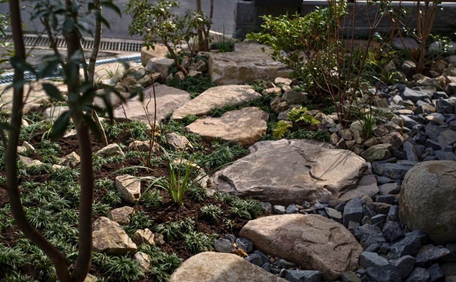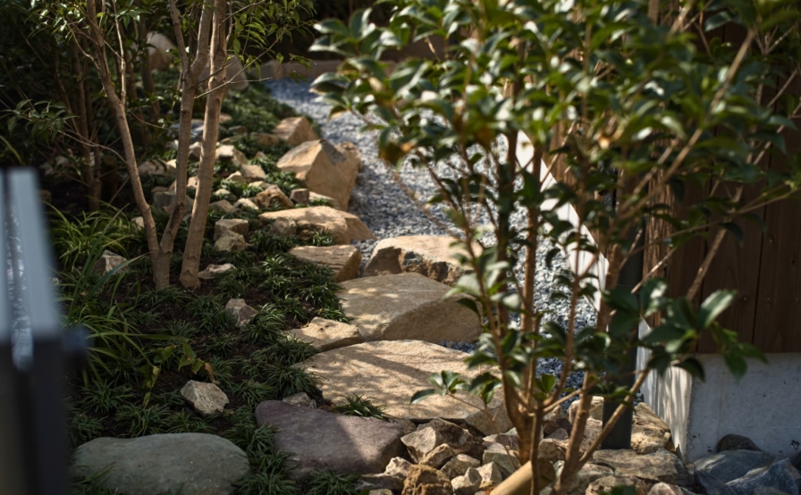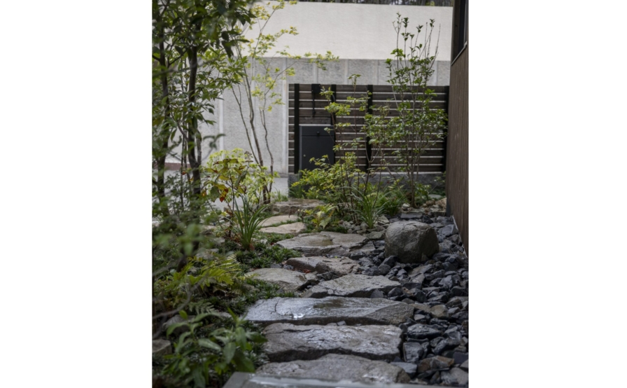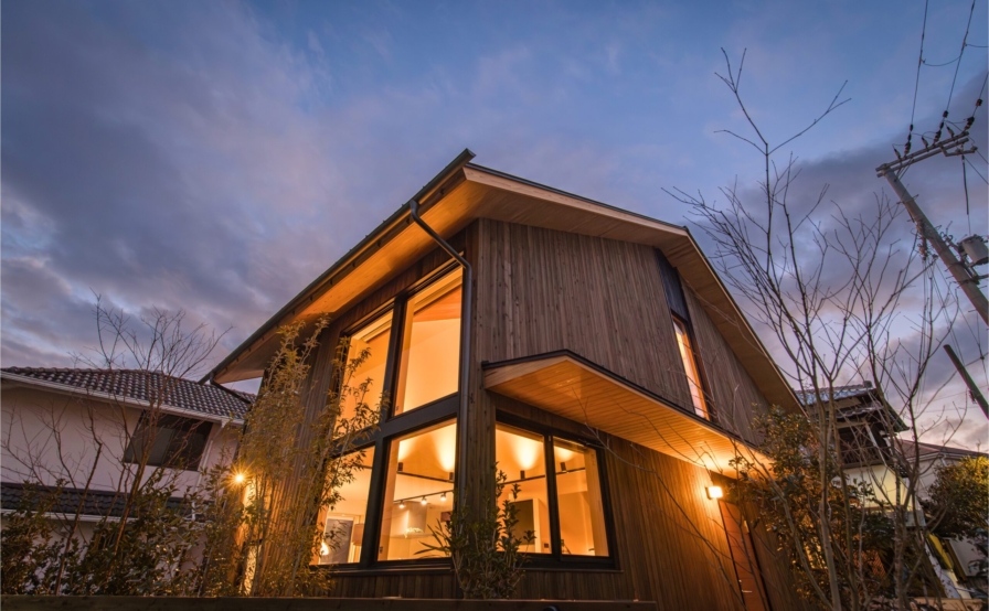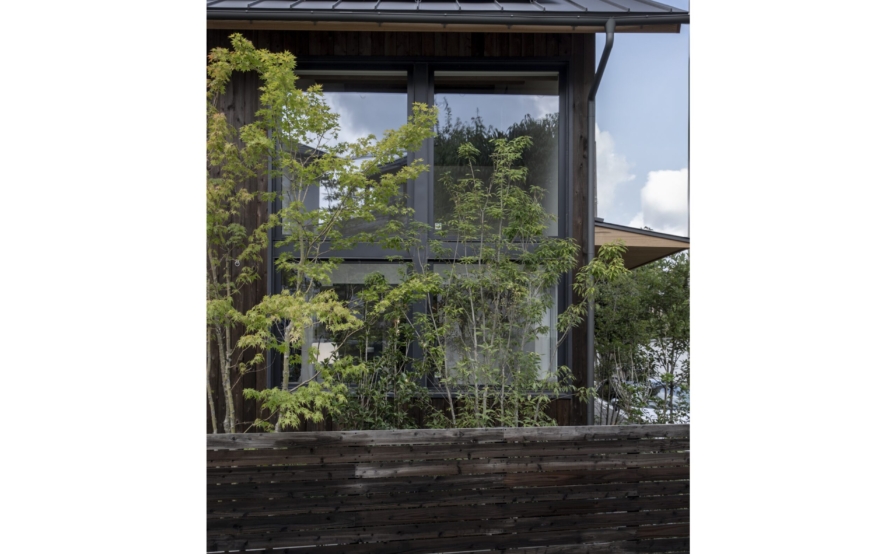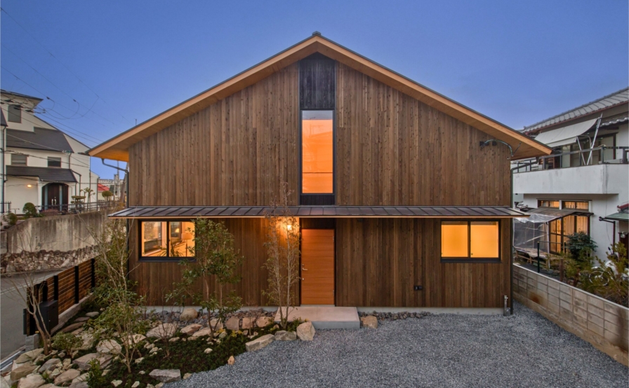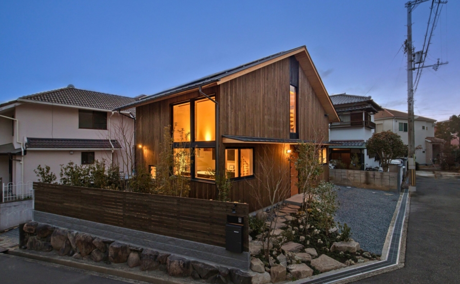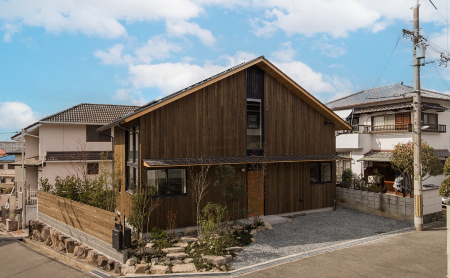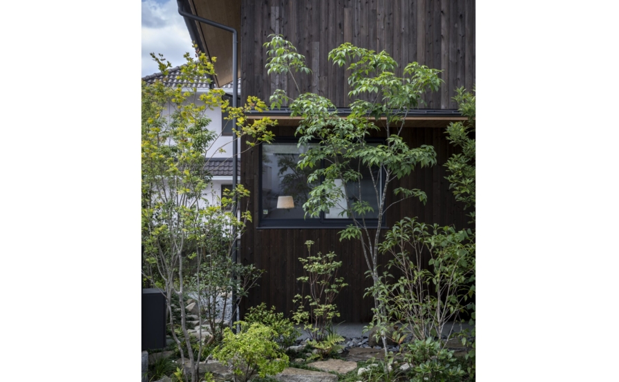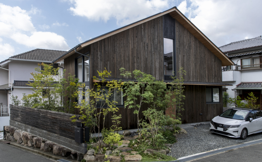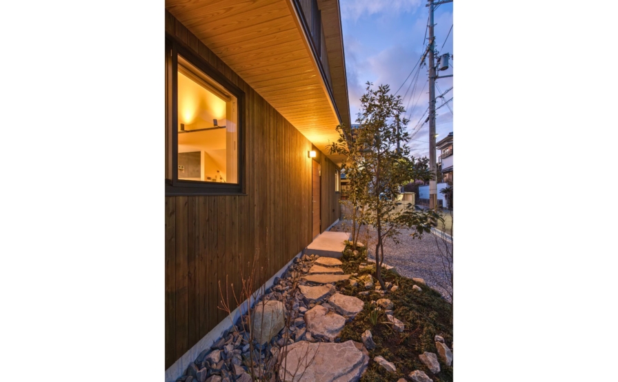 端正な切妻屋根と屋久島地杉の外壁が織りなす佇まいは、風景にそっと溶け込みながらも、見る人の心に残る静かな美しさを宿す。住まいを囲む庭は、室内とつながる“もうひとつの居場所”。草木が風に揺れ、光と影が移ろい、季節の変化が日常に寄り添う。この静かな庭が、住まいと家族の記憶をやさしく育んでいく。