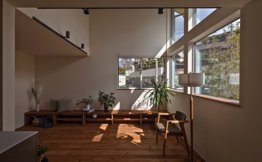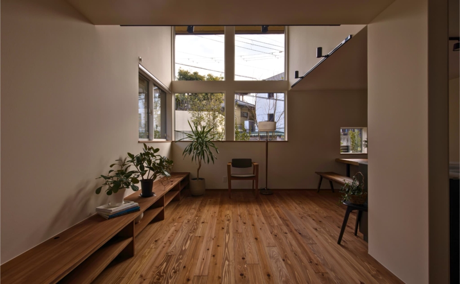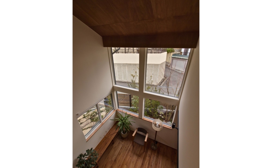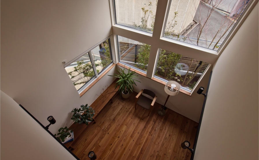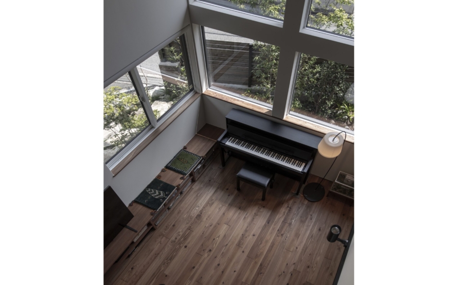 南面の4連層の大開口からは光が流れ込み、自然と呼応する心地よさが広がる。敷地は法規制が重なり、建蔽率や高さに厳しい制限がある中で、1階に生活の主要機能を集約した“1階完結型”の間取りを計画。吹抜けを通じて縦に視線と光を抜き、限られた面積でものびやかな空間を実現している。